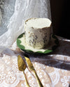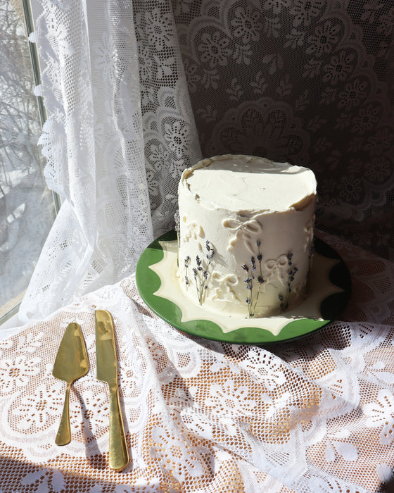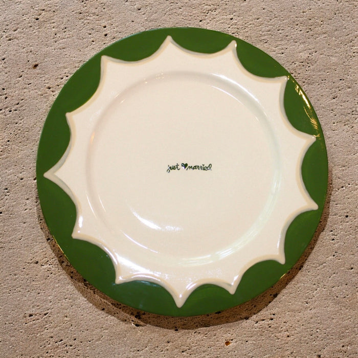 Celebrate chic wedding bliss with our hand-painted, scalloped ceramic cake plate, inscribed with “just married”